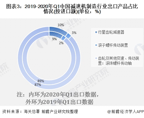 近年來,除“齒輪及其他變速、傳動(dòng)裝置:滾珠螺桿傳動(dòng)軸”外,其余產(chǎn)品的出口份額均有所下降。2020年第一季度,“齒輪及其他變速、傳動(dòng)裝置:滾珠螺桿傳動(dòng)軸”的出口額占到了中國減速機(jī)制造行業(yè)出口產(chǎn)品總出口額的89%。